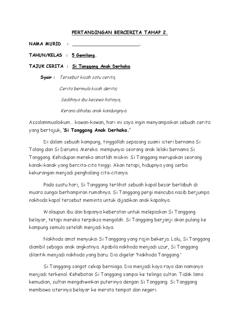 Skrip cerita tahap 1 si tanggang anak derhaka hei perempuan tua jangan engkau pandai pandai. Teks cerita pertandingan bercerita bahasa melayu tahap 1. Sekolahkebangsaan sungai menghulu jalan batu asah 07000 langkawi kedah.